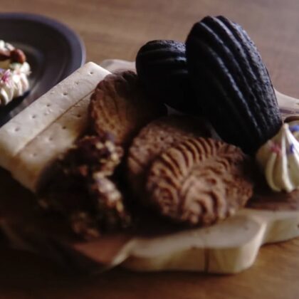 炭パウダーを入れて作った米粉のマドレーヌ酒粕入ったショートブレッド風チーズみたいな味になりますよ卵白が余ったら冷凍しておいて気が向いたらメレンゲ焼きます♪よく質問いただく模様の入ったサブレはペーズリー柄のロールですスペルト小麦とアーモンドのサブレです